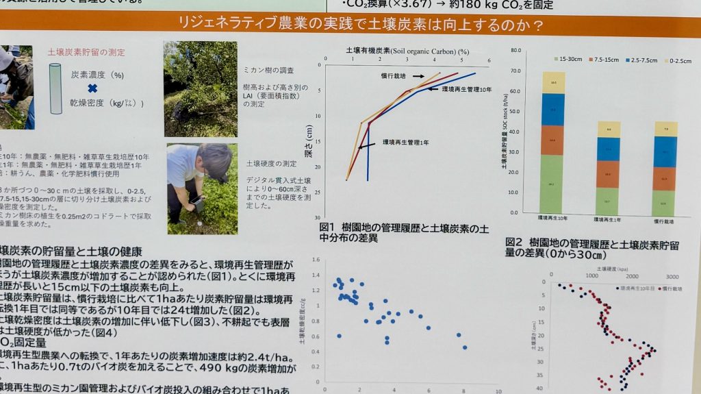 会場では、土壌構造・炭素貯留・生態系の回復に関心を寄せる研究者や農家の方が多く、当園の実践データに興味を持ってくださる方々もいらっしゃいました。