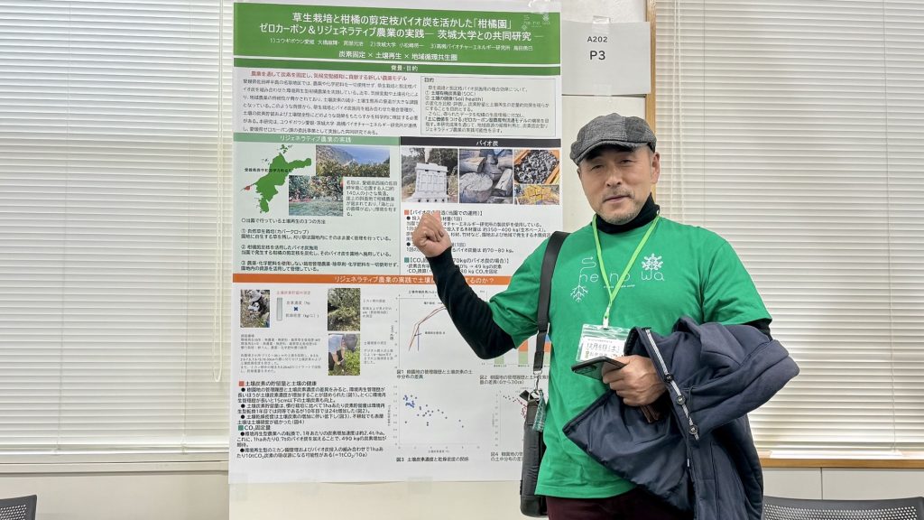 今回、私たちユウギボウシ愛媛はポスター発表の場をいただき、名取で取り組む バイオ炭と下草を活かしたリジェネラティブ農法、そして現地調査を通じて得られた最新データを紹介しました。